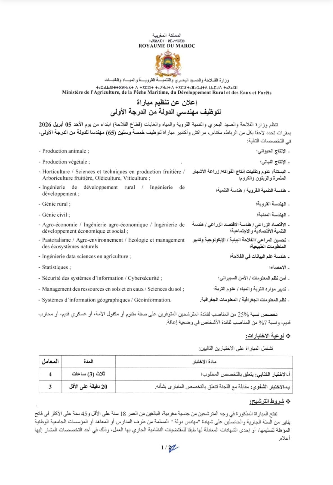 Dans le cadre de ses efforts pourrenforcerses ressources humaines et soutenir les talents nationaux, le ministère de l’Agriculture a annoncé un nouveau concours de recrutement pour 2026, visant à pourvoir 65 postes dans divers domaines et spécialisations clés. Ce concours s’inscrit dans le développement dynamique du secteur agricole du Royaume, destiné à améliorer la performance institutionnelle et à accompagner les grands projets en milieu rural et agricole. Cette opportunité représente une étape importante pour les jeunes possédant les qualifications requises et souhaitant intégrer le secteur public. Le ministère a établi des conditions et des critères précis pour candidater, ainsi qu’un calendrier spécifique pour le dépôt des candidatures et le passage des épreuves. Cet article fournit des informations détaillées sur le concours, les spécialisations requises, les conditions d’admissibilité et la procédure d’inscriptiono fficielle.